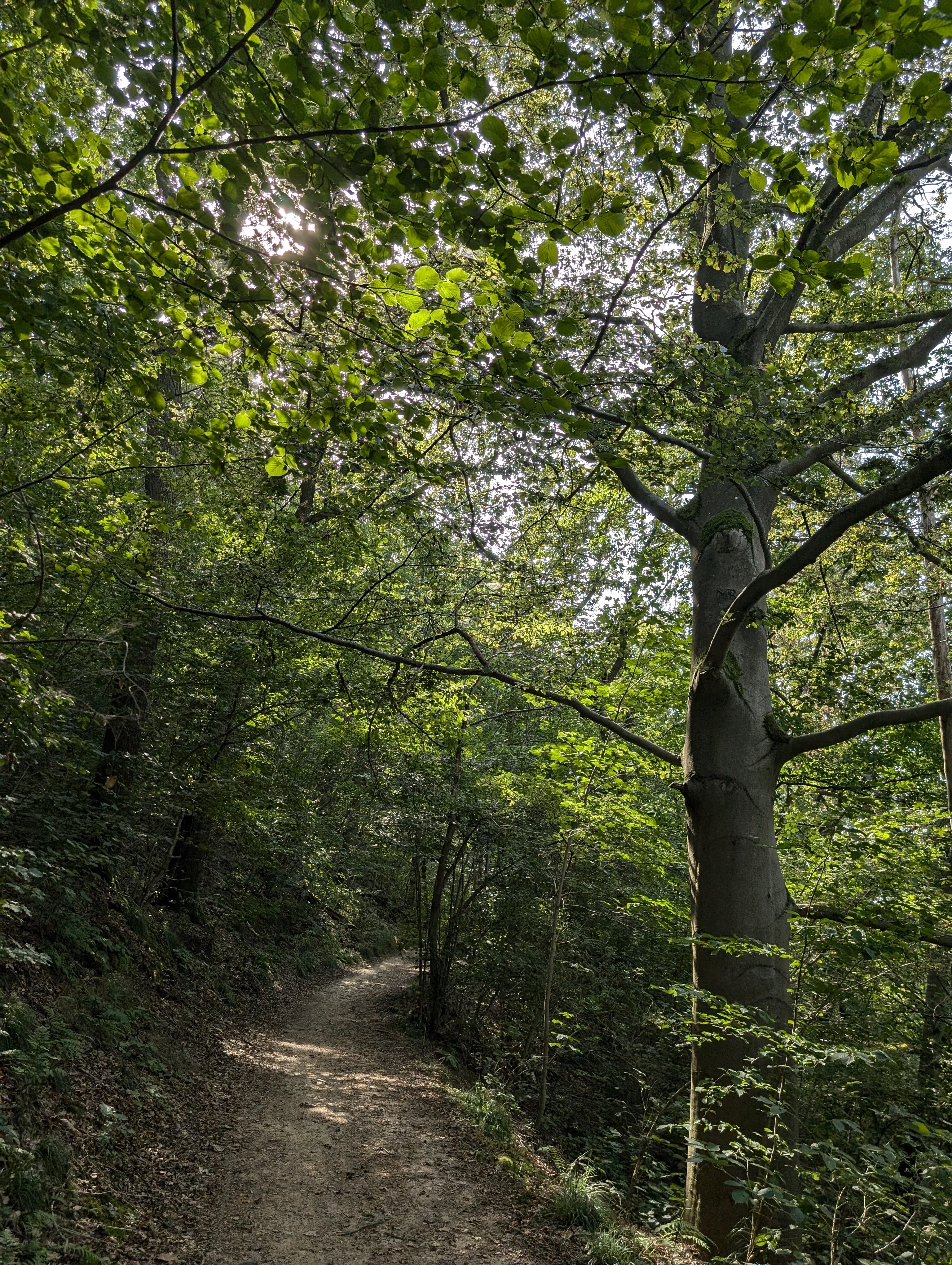 Lange hält die Idylle nicht vor, denn ab Remse laufe ich wieder auf der Straße. Es sind 32°C und ich schwitze. Als ich die Straße verlassen kann, verläuft der Lutherweg auf die Überschwemmungswiesen in der prallen Sonne nach Reinholdshain. Dort habe ich noch ein kleines Stück durch ein Wäldchen, entlang der Bahnlinie zu laufen. Was für eine Wohltat.